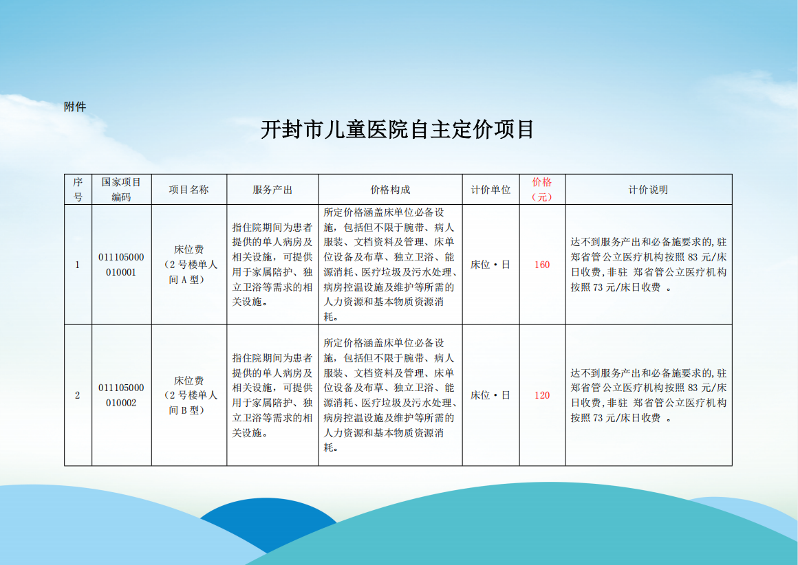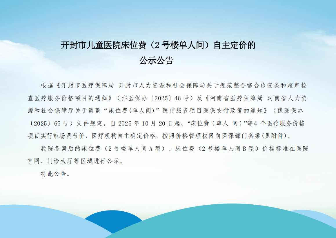 开封市儿童医院床位费(2号楼单人间)自主定价的公示公告
